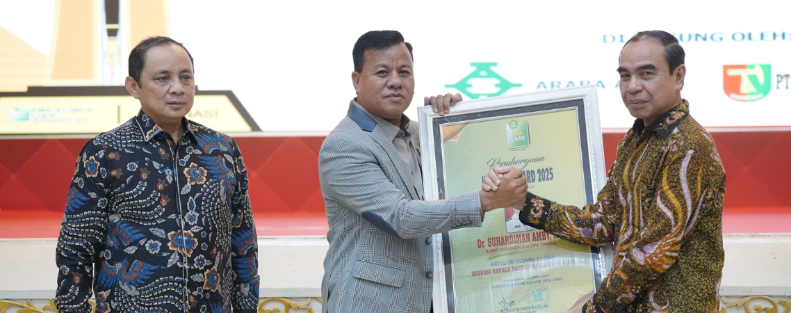 Pekanbaru - Bupati Kuantan Singingi (Kuansing) Dr. H. Suhardiman Amby, MM meraih Penghargaan Kategori Alumni Pilihan "Inovasi Kepala Daerah Kabupaten/Kota" dalam acara Malam Anugerah Ikatan Keluarga Alumni Universitas Riau (IKA UNRI) Award 2025, di Balai Serindit Pekanbaru, Jumat (25/04/2025). Penghargaan tersebut merupakan apresiasi...
