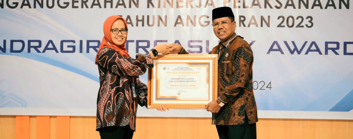 Inhu - Pemerintah Kabupaten (Pemkab) Kuantan Singingi (Kuansing) menerima penghargaan "Terbaik Pertama" Kategori Penyaluran Dana Desa 2023 dari Kantor Pelayanan Perbendaharaan Negara (KPPN) Pratama Rengat. Piagam penghargaan itu diterima oleh Bupati Kuansing Dr. H. Suhardiman Amby, Ak., MM diwakili Staf Ahli Ir. H. Samsir Alam, MM...