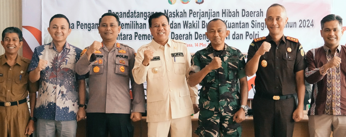 Teluk Kuantan - Bupati Kuantan Singingi (Kuansing) Dr. H. Suhardiman Amby, Ak., MM melakukan Penandatanganan Naskah Perjanjian Hibah Daerah (NPHD) untuk Kegiatan Pengamanan Pemilihan Bupati dan Wakil Bupati Kuansing Tahun 2024. Kegiatan penandatangan tersebut dilakukan antara Pemerintah Kabupaten Kuansing dengan TNI/POLRI tentang...