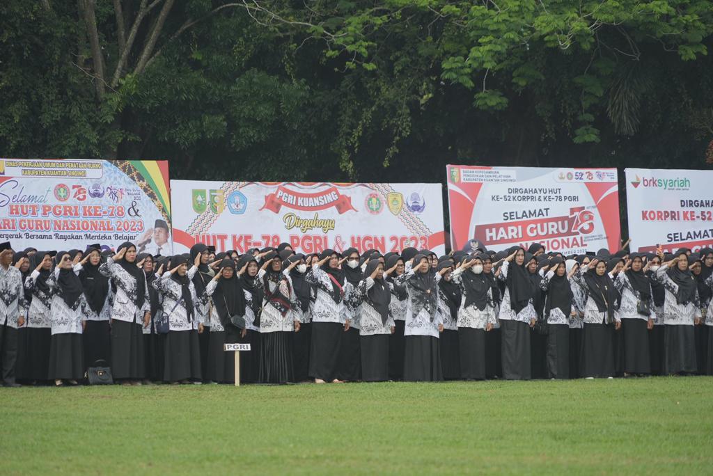 Teluk Kuantan - Pemerintah Kabupaten Kuantan Singingi bersama Persatuan Guru Republik Indonesia (PGRI) serta Korps Pegawai Republik Indonesia (KORPRI) menggelar upacara dalam memperingati HUT KORPRI Ke- 52 dan dan HUT PGRI yang Ke- 78 atau Hari Guru Nasional Tahun 2023 Tingkat Kabupaten Kuansing Di Lapangan Limuno Teluk Kuantan, Rabu...